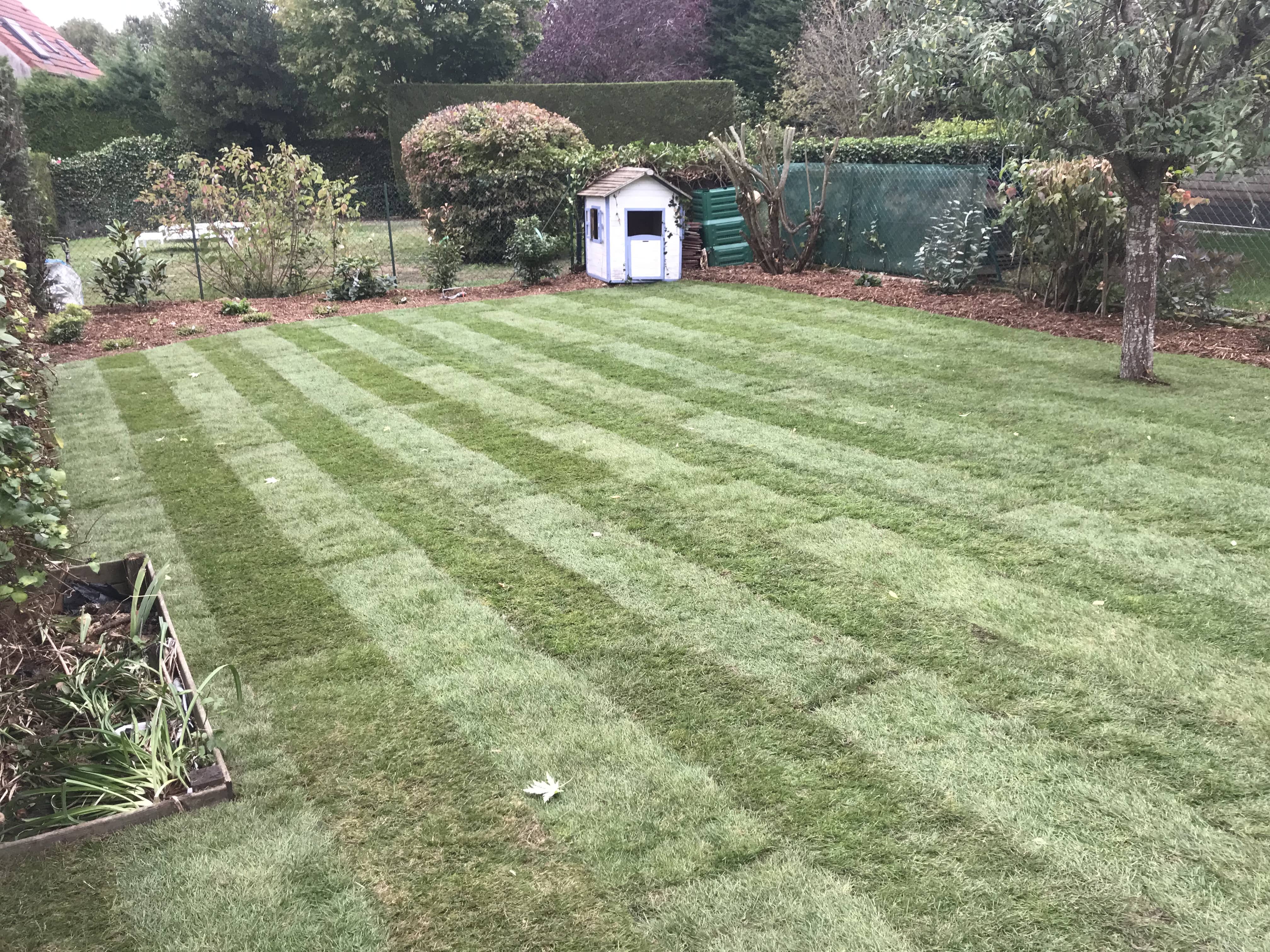Réalisation des massifs, plantations et paillages, engazonnement en rouleaux